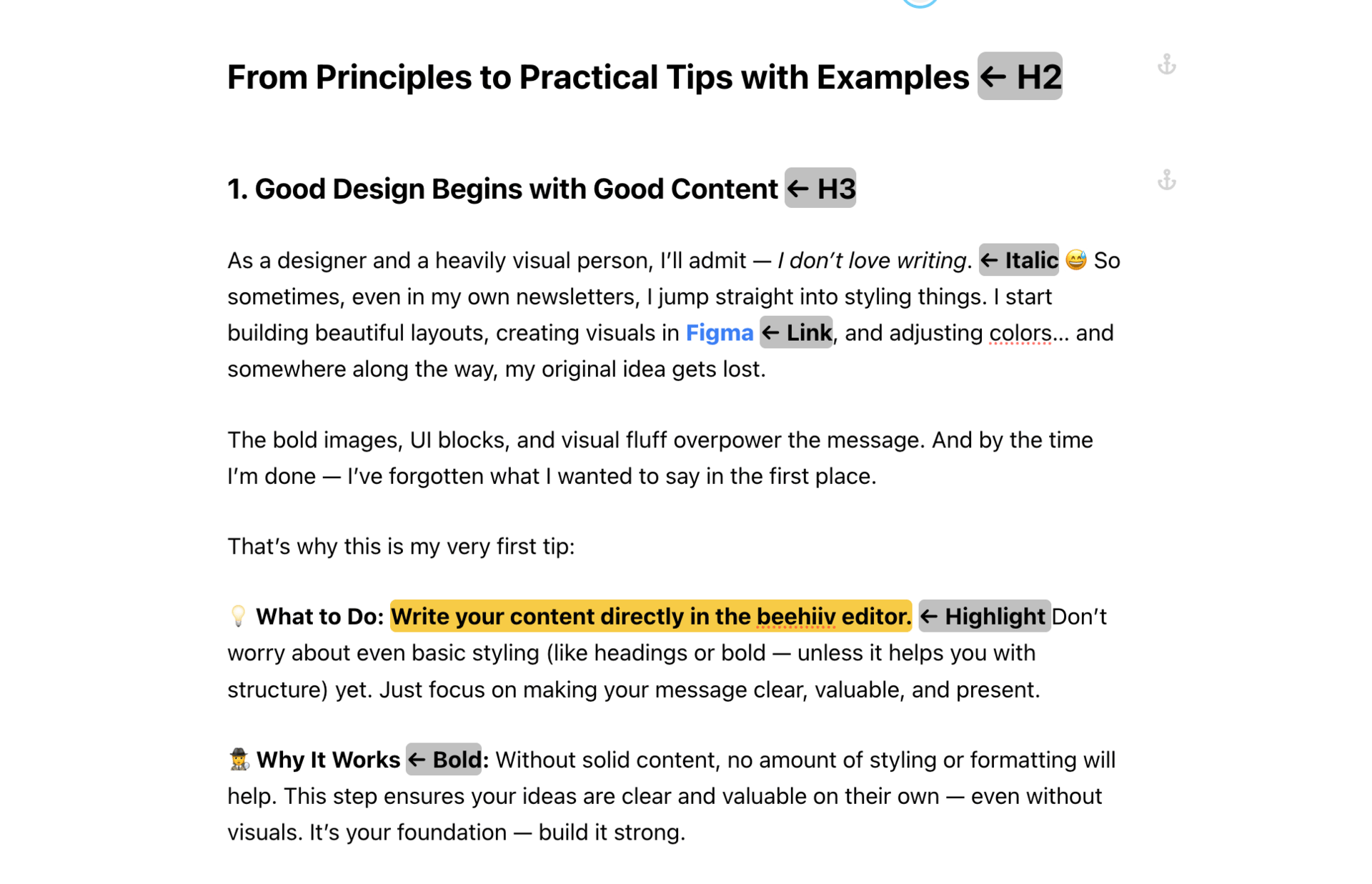 What to Do: Write your content in the beehiiv editor first. Don’t worry about even basic styling (like headings or bold — unless it helps you with structure) yet. Just focus on making your message clear, valuable, and present.
