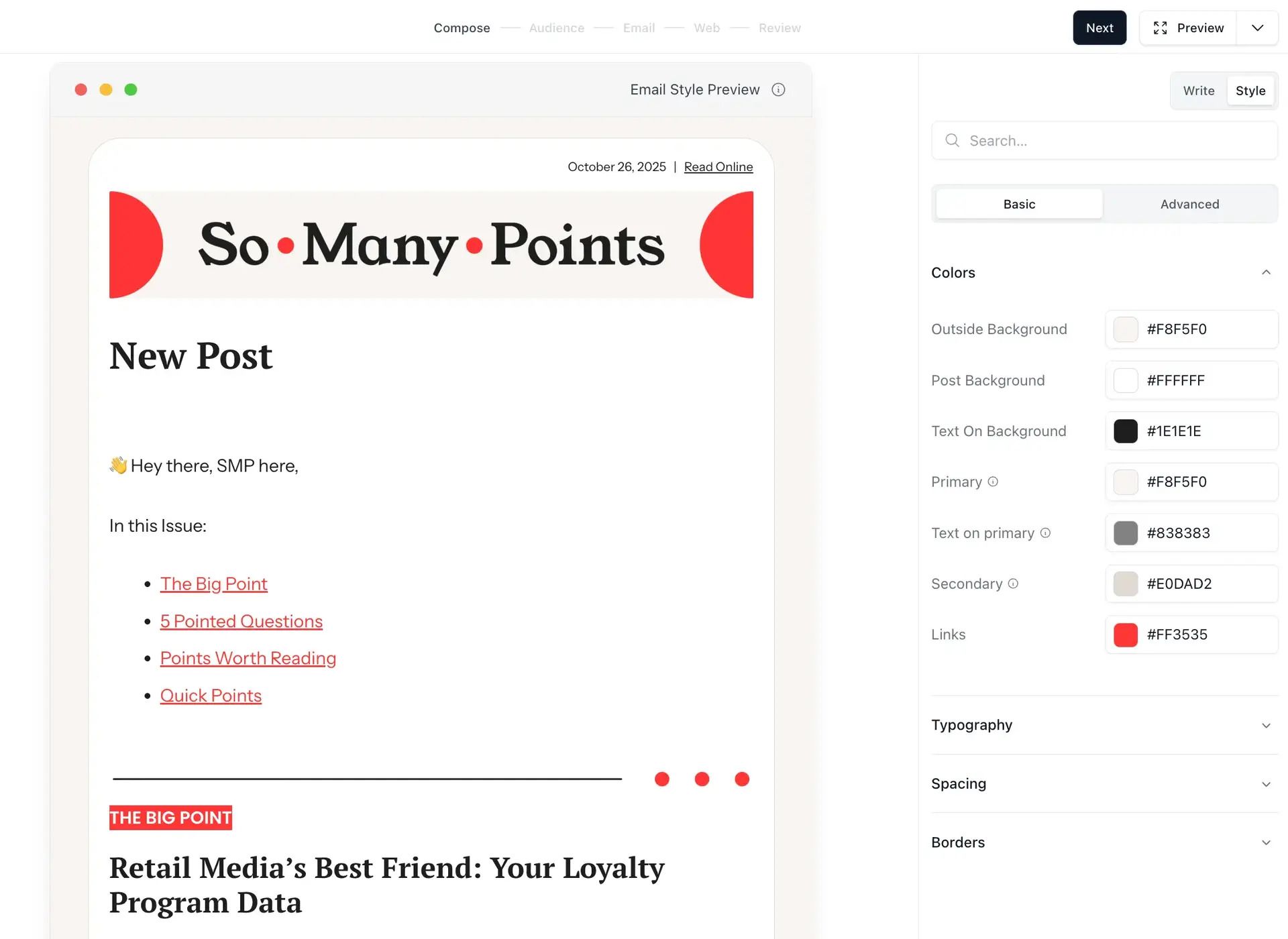 What to Do: Use beehiiv’s advanced style settings or custom sections to apply your visual identity: