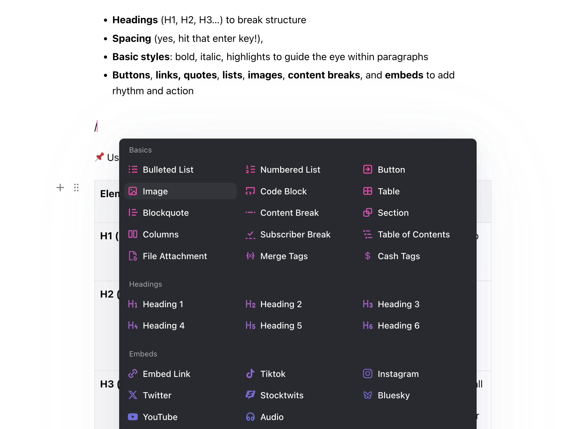 Example: Formatting this post in beehiiv editor using text styles, headings and widgets.